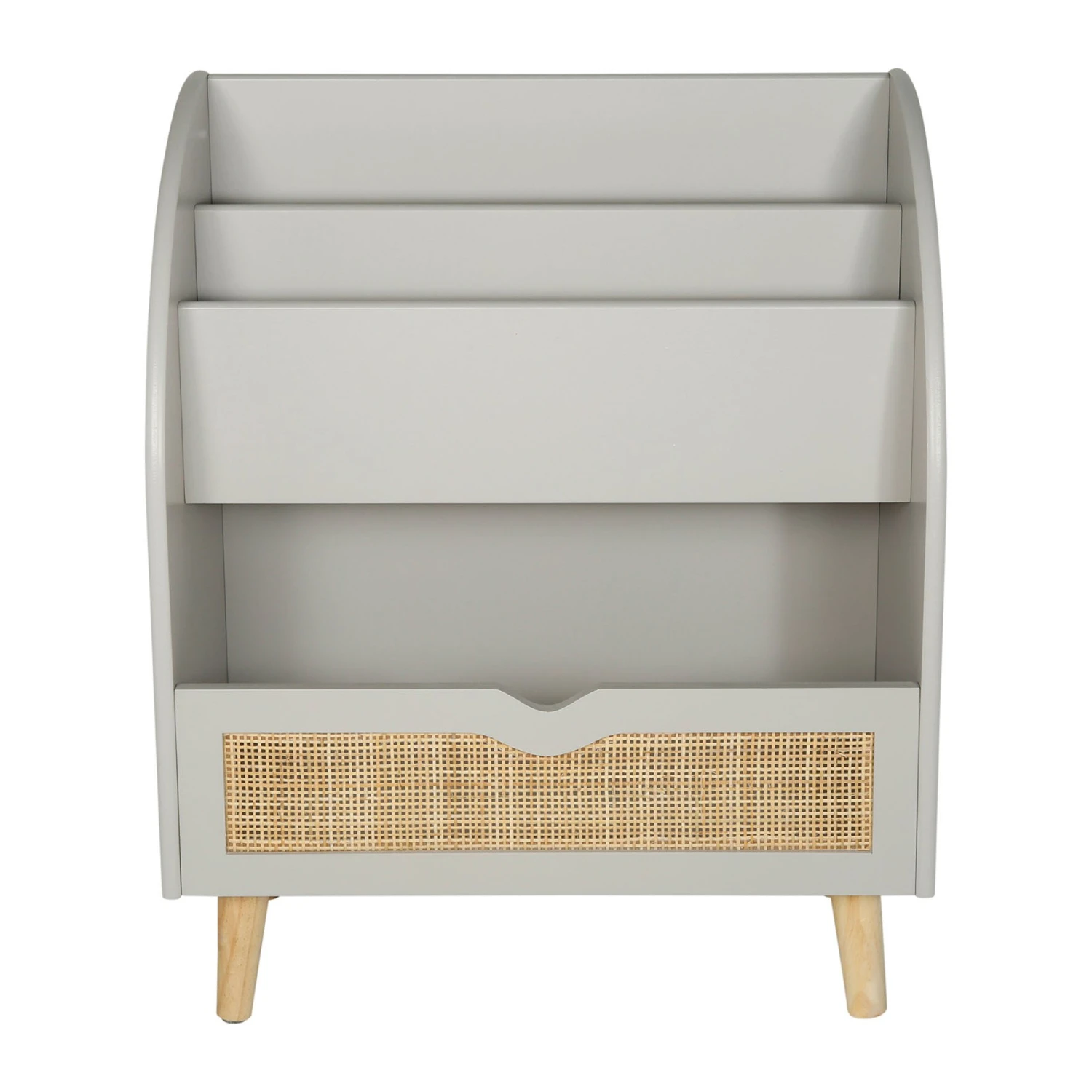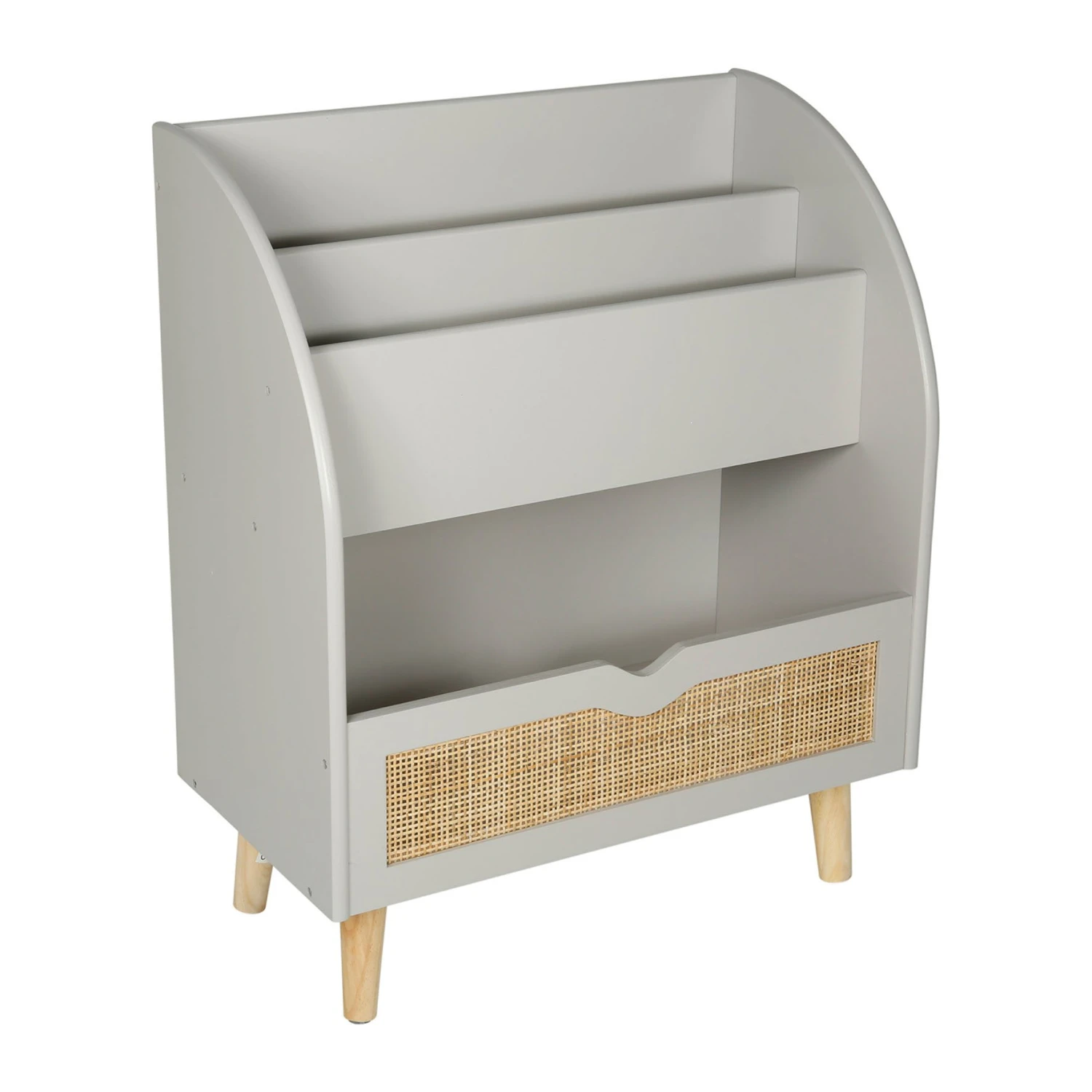 On adore le style naturel de cette bibliothèque pour enfant, en bois et cannage.