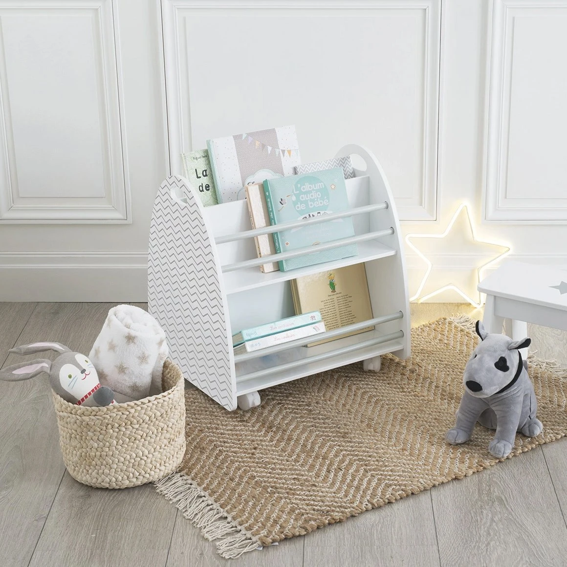 Une bibliothèque en bois pour ranger et retrouver facilement tous les livres préférés de vos enfants. Pratique, elle possède des étagères aussi bien au recto qu’au verso.