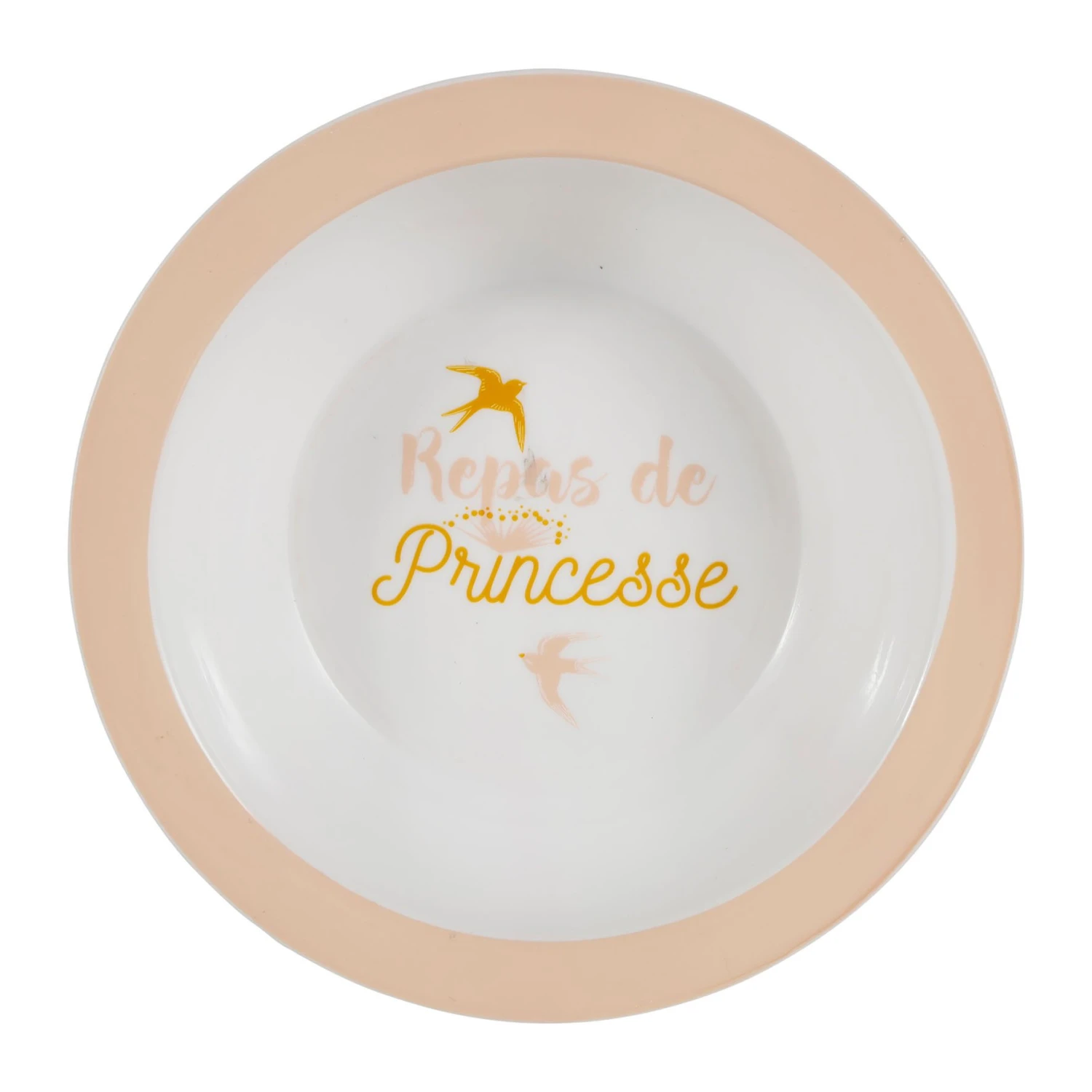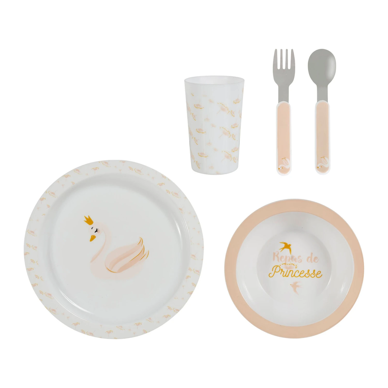 Ce coffret contient 1 assiette plate, 1 assiette creuse, 1 verre, 1 fourchette et 1 cuillère.