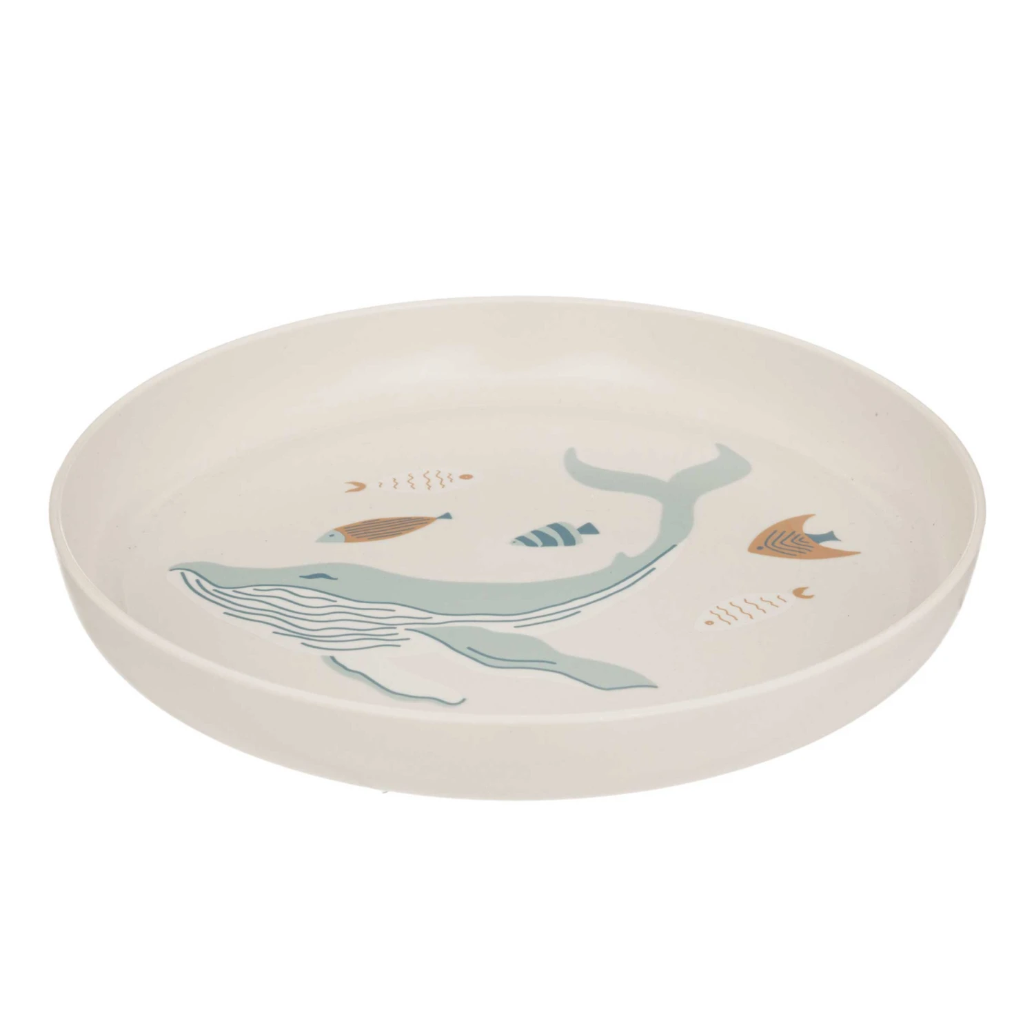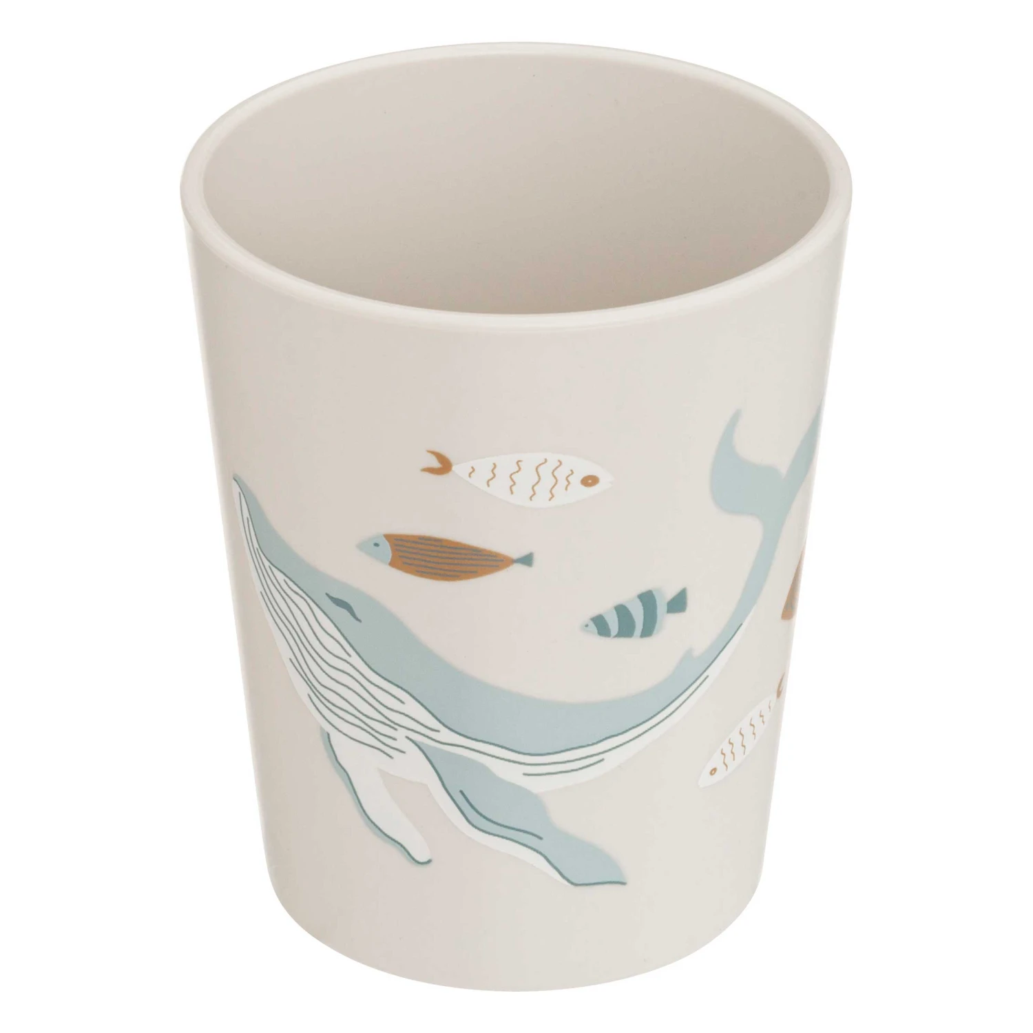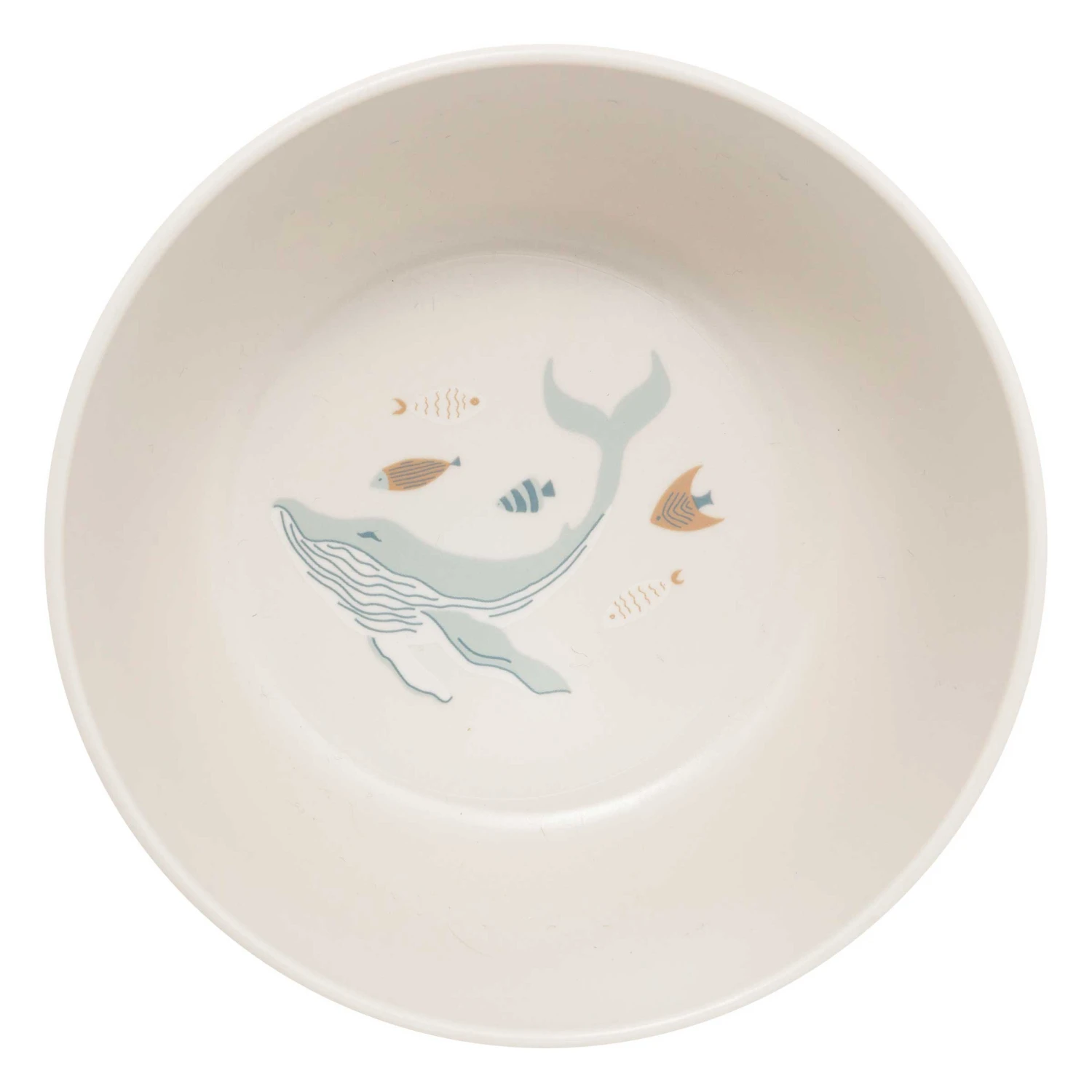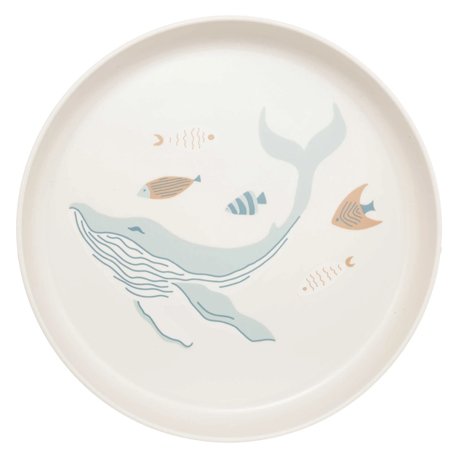 Il comporte 1 assiette, 1 bol, 1 verre, 1 fourchette et 1 cuillère, le tout ultra résistant et à l’effigie d’une belle baleine.