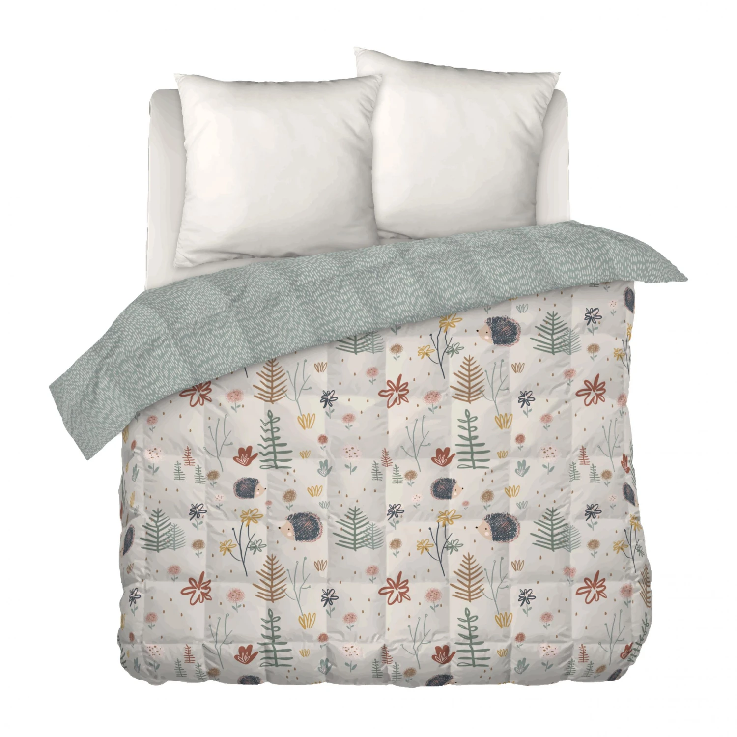 Imprimé : couette à motifs forêt et hérisson, au recto et verso.