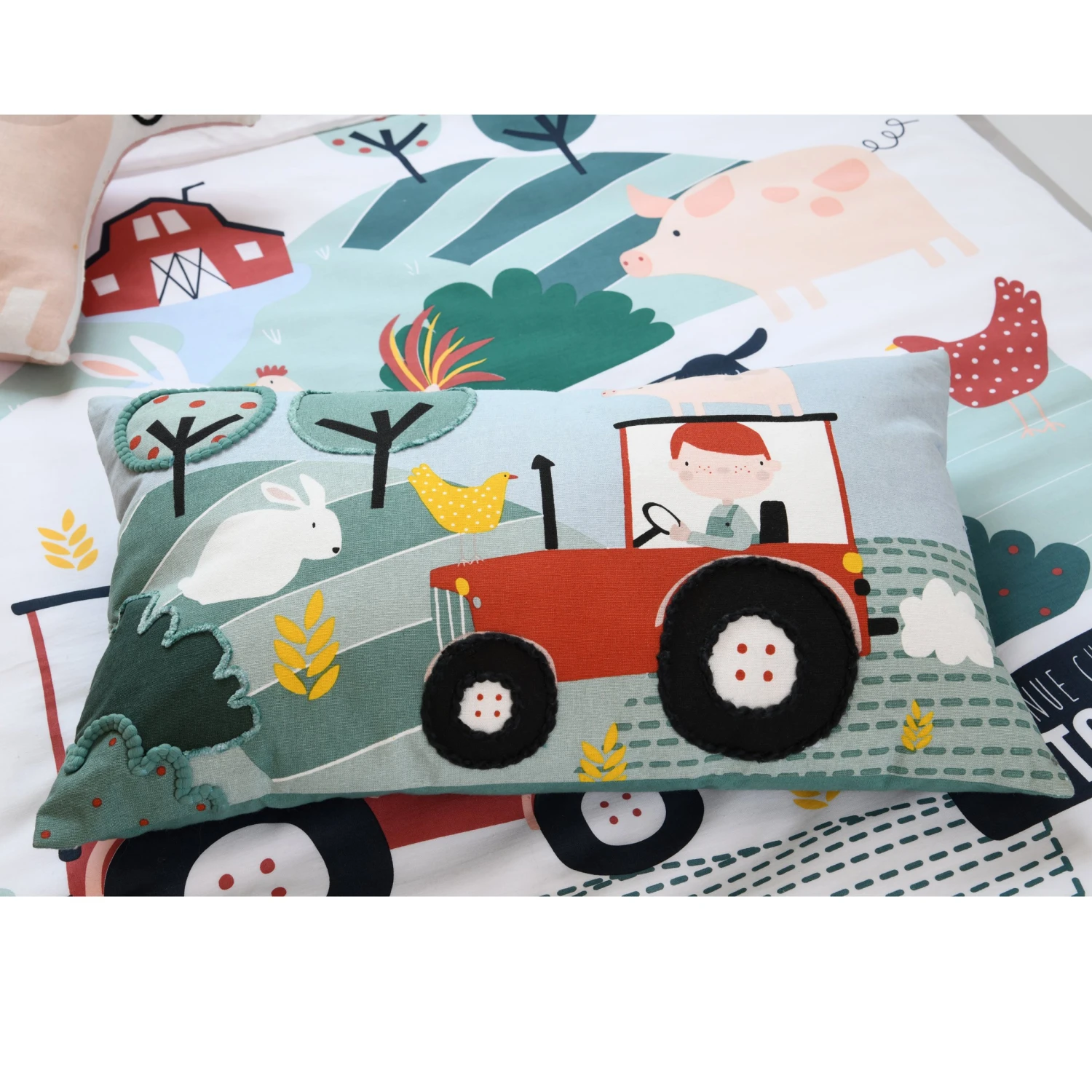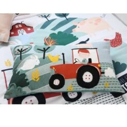 La ferme s’invite dans la chambre de votre enfant avec ce coussin coloré et fun.