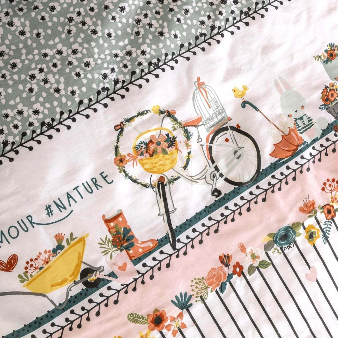 Imprimé : housse de couette à motifs fleuris et à rayures.
