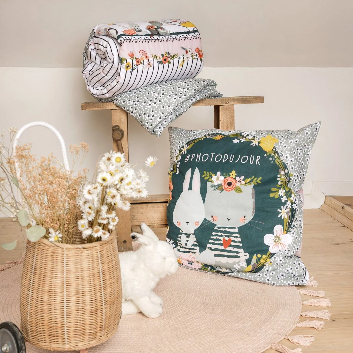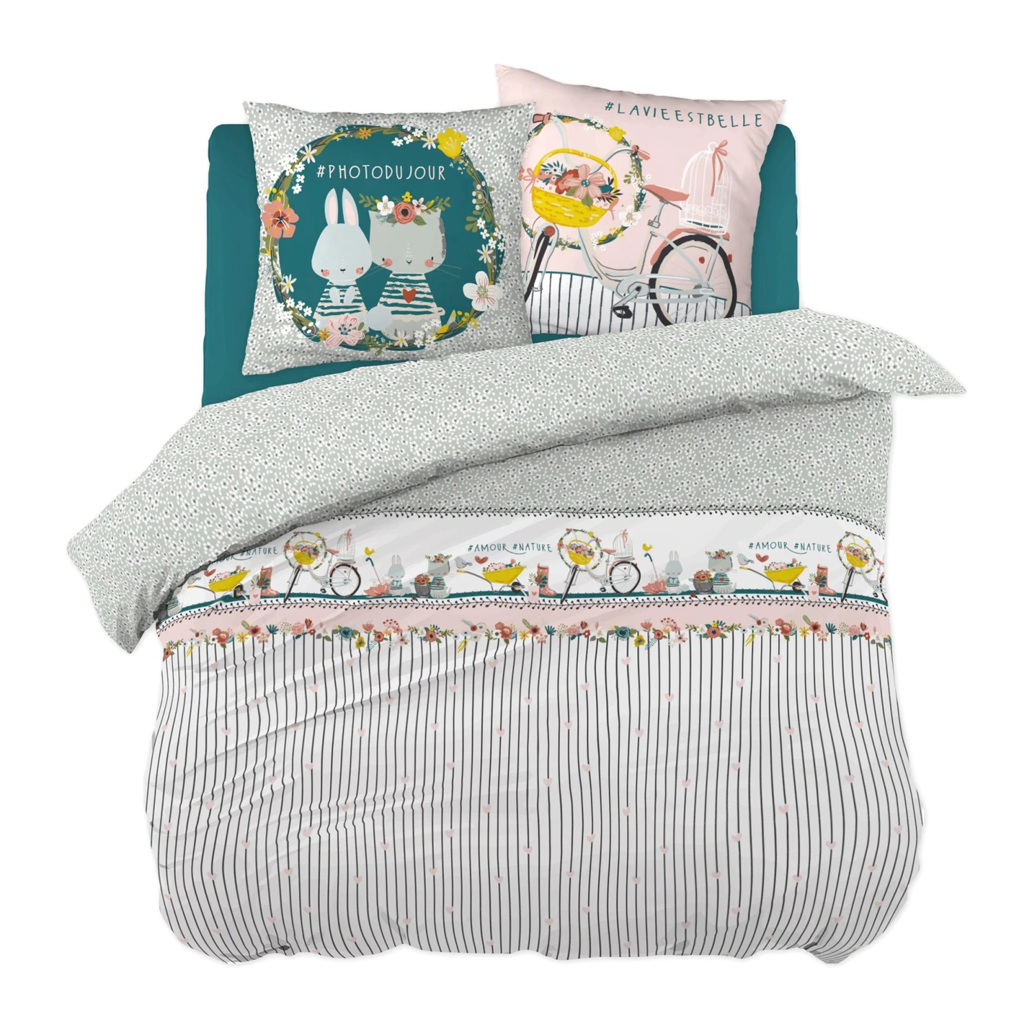 Finition : housse de couette rĂ©versible motifs imprimĂ©s recto / verso, fermeture Ă boutons en bois. Taies d’oreiller Ă motifs recto / verso, finition portefeuille. Labels OEKO-TEX et BSCI. Emballage Ă©co responsable et rĂ©utilisable (petit sac en coton).