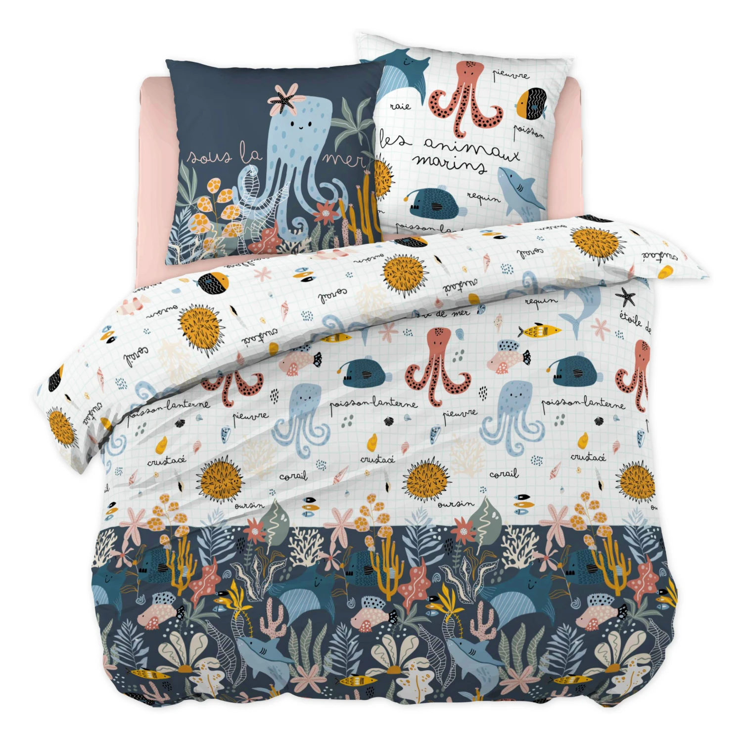 Imprimé : housse de couette à motifs pieuvre et fond marin, au recto et verso.