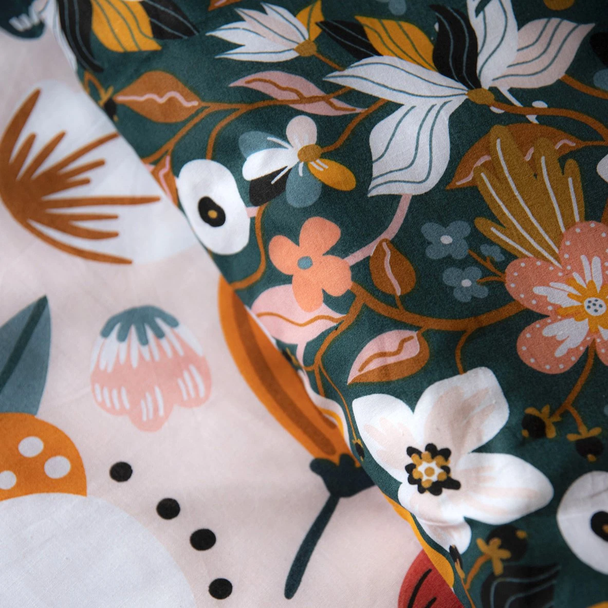 Finition : housse de couette motifs imprimés recto et unie au verso, fermeture à boutons en bois. Taie d’oreiller motifs recto / verso, finition portefeuille. Labellisée OEKO-TEX.