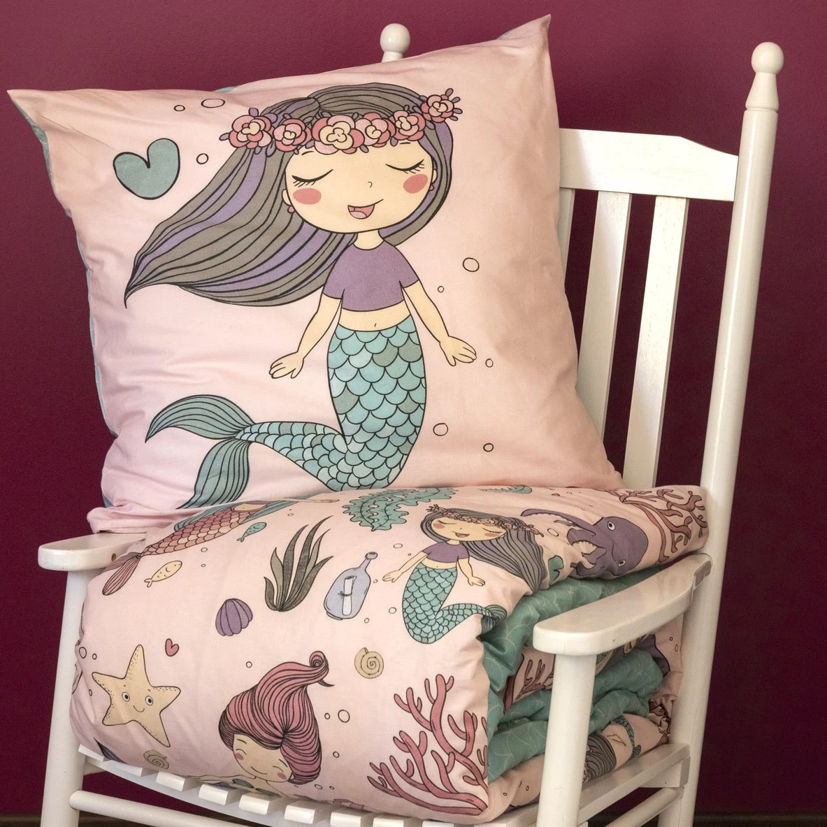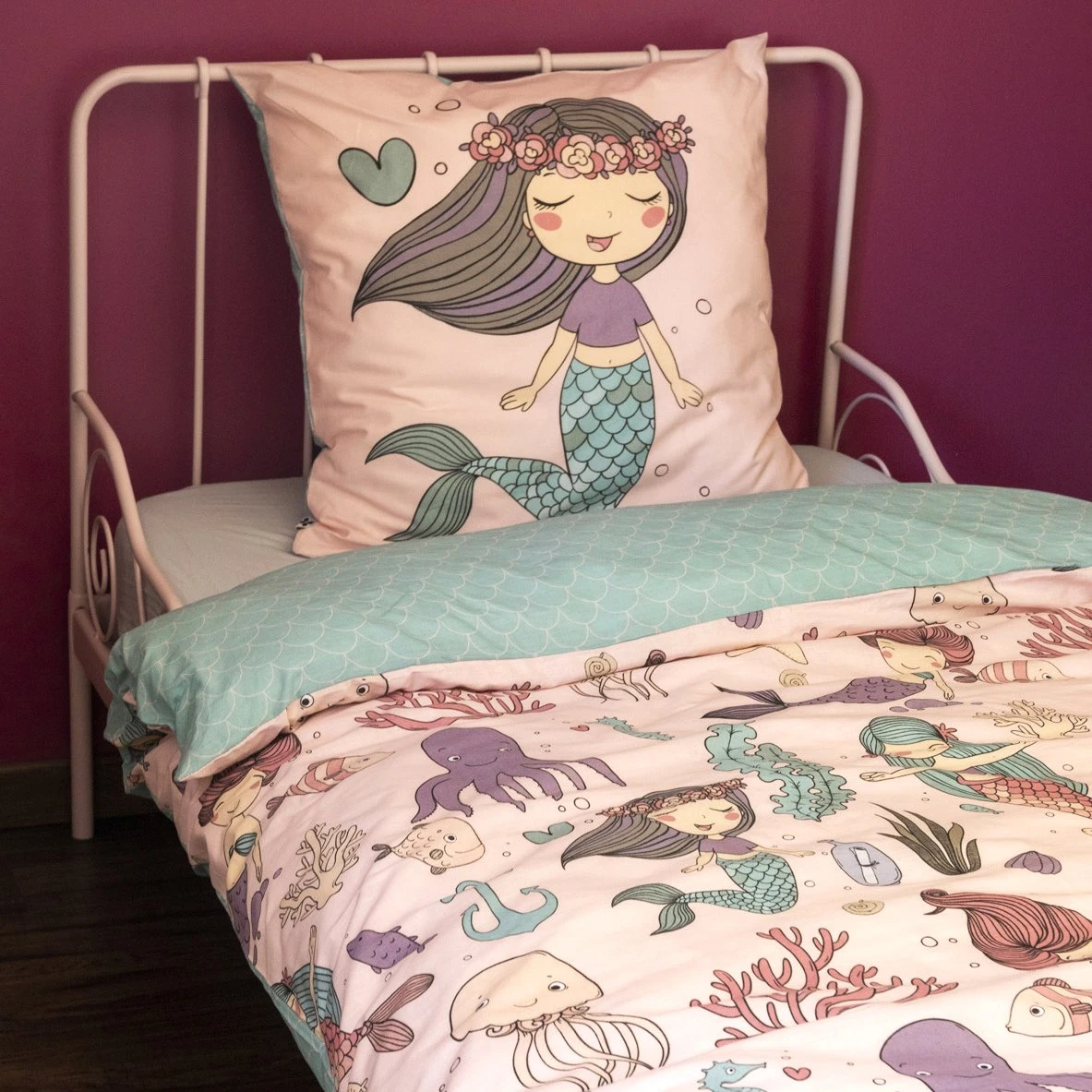 Plongez dans un univers féerique avec cette housse de couette à l’effigie de sirènes et d’animaux marins.