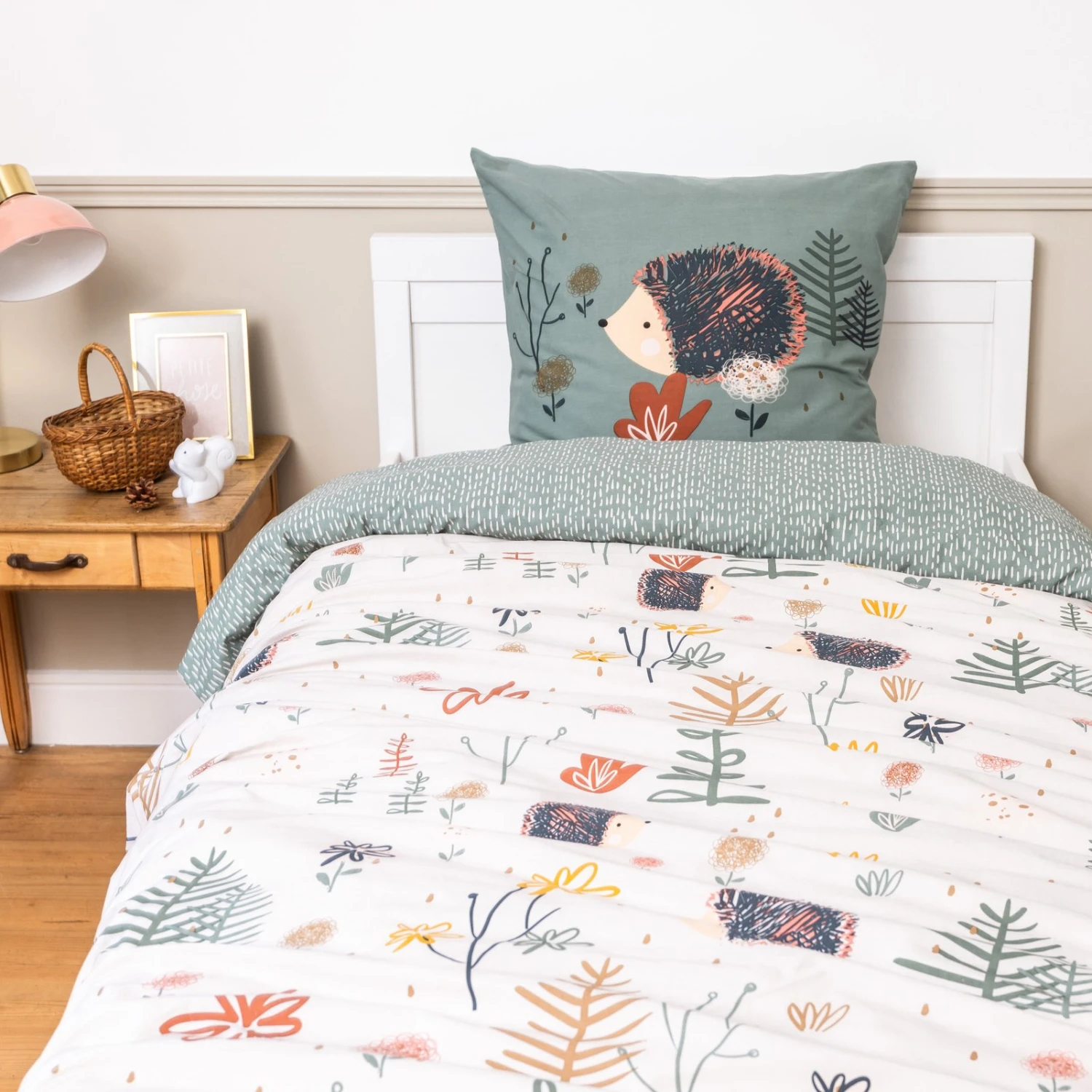 Imprimé : housse de couette à motifs végétal et hérisson esprit forêt, au recto et verso.