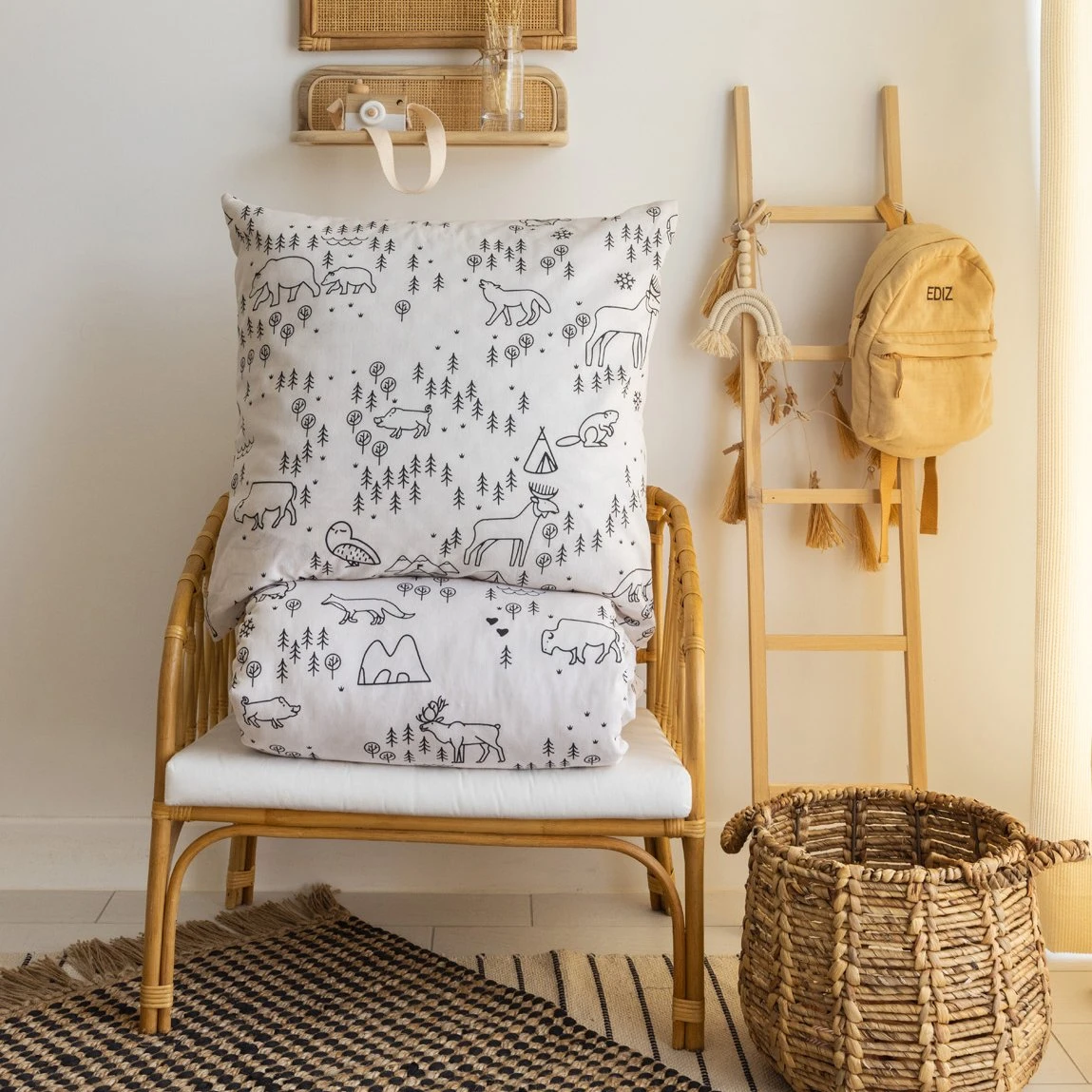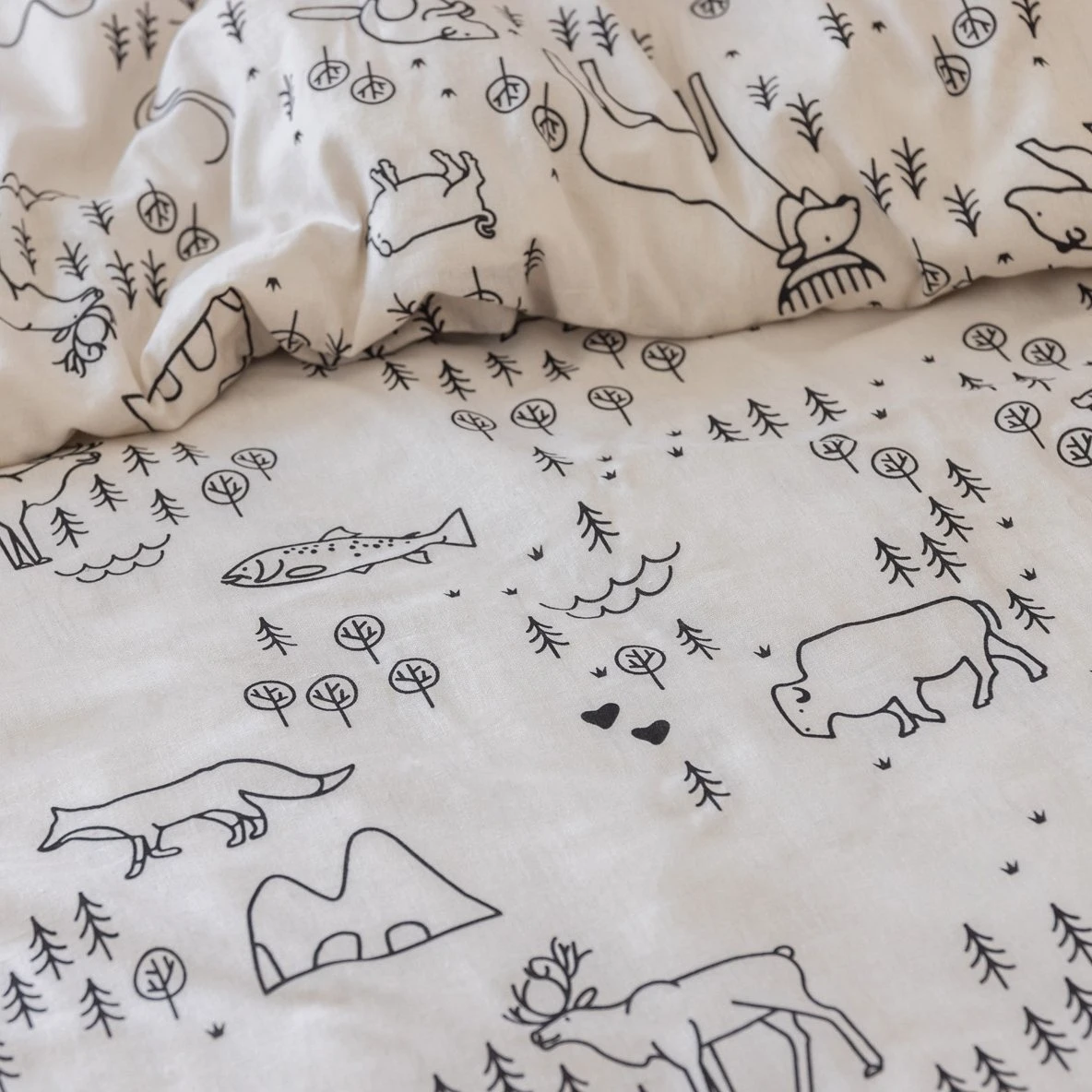 ImprimĂ© : housse de couette Ă motifs animaux et forĂȘt.