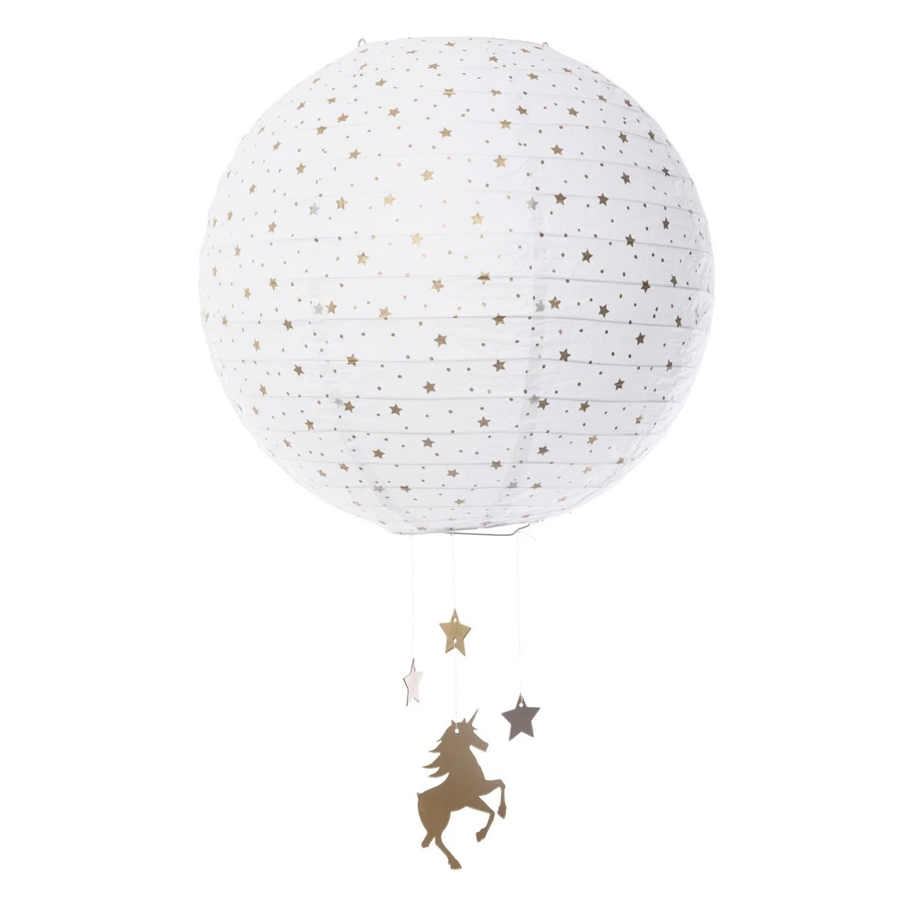 Décorez la chambre de votre fille avec cet abat-jour effet lanterne japonaise en papier. Il fera sensation dans la chambre avec ses étoiles et sa figurine licorne.