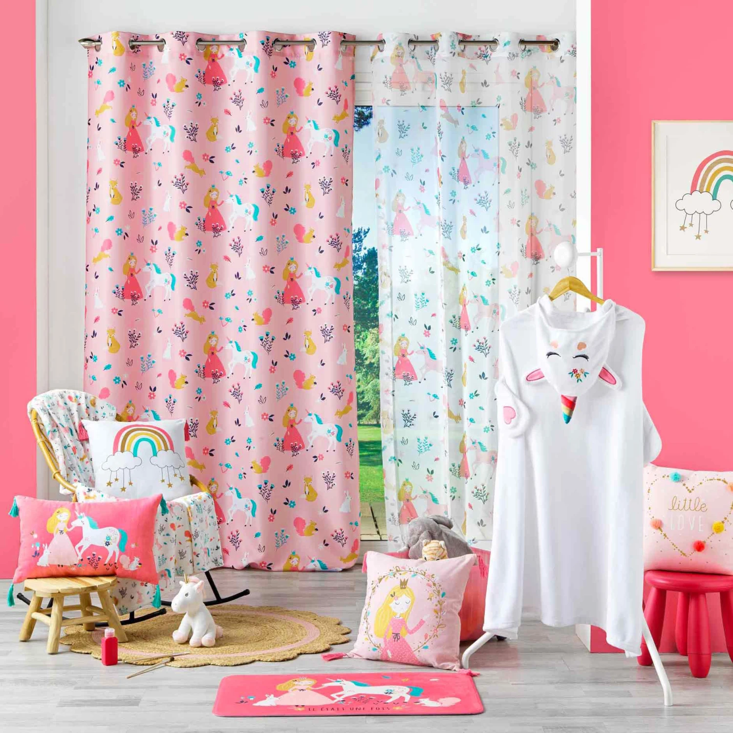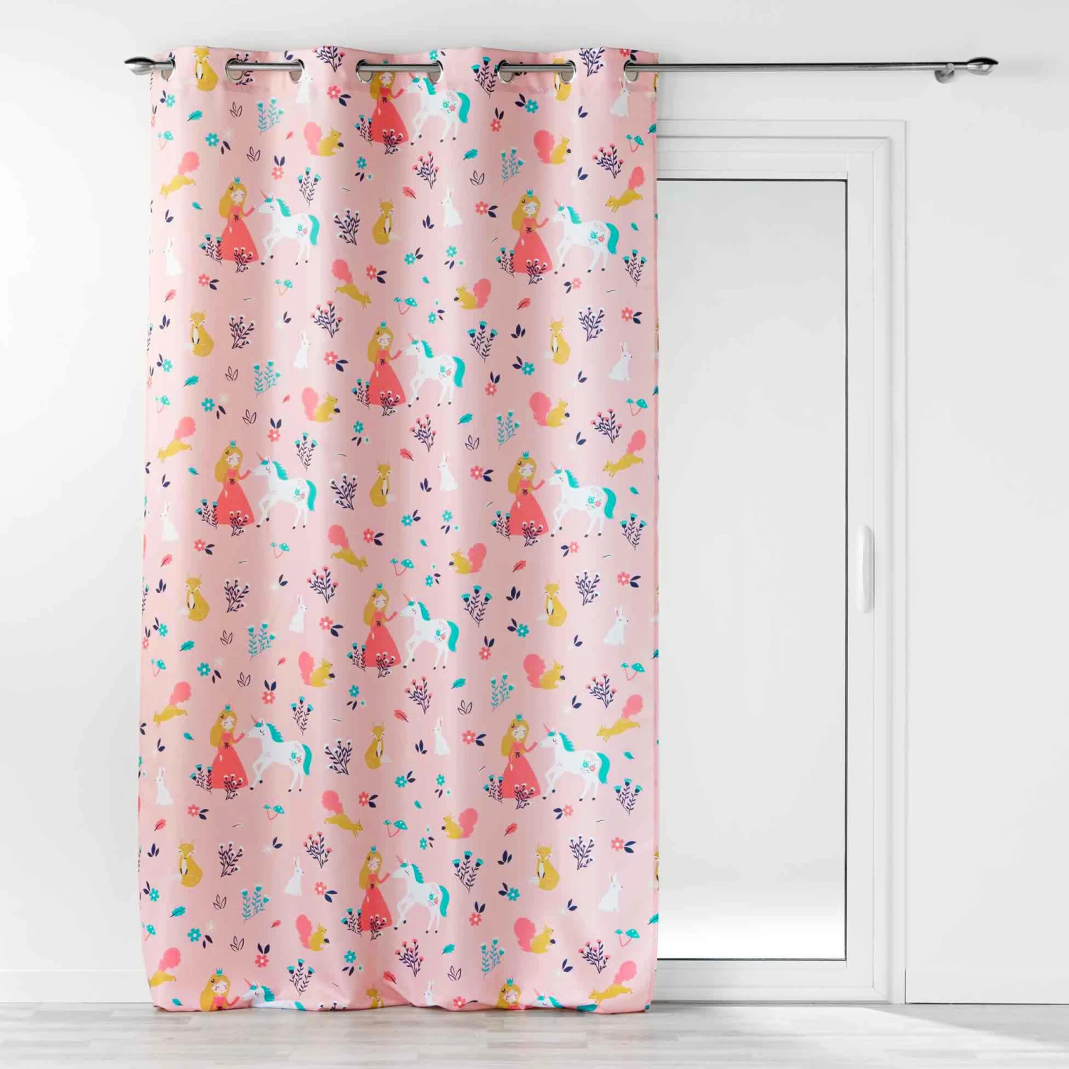Imprimé : rideau à motifs licorne et princesse.
