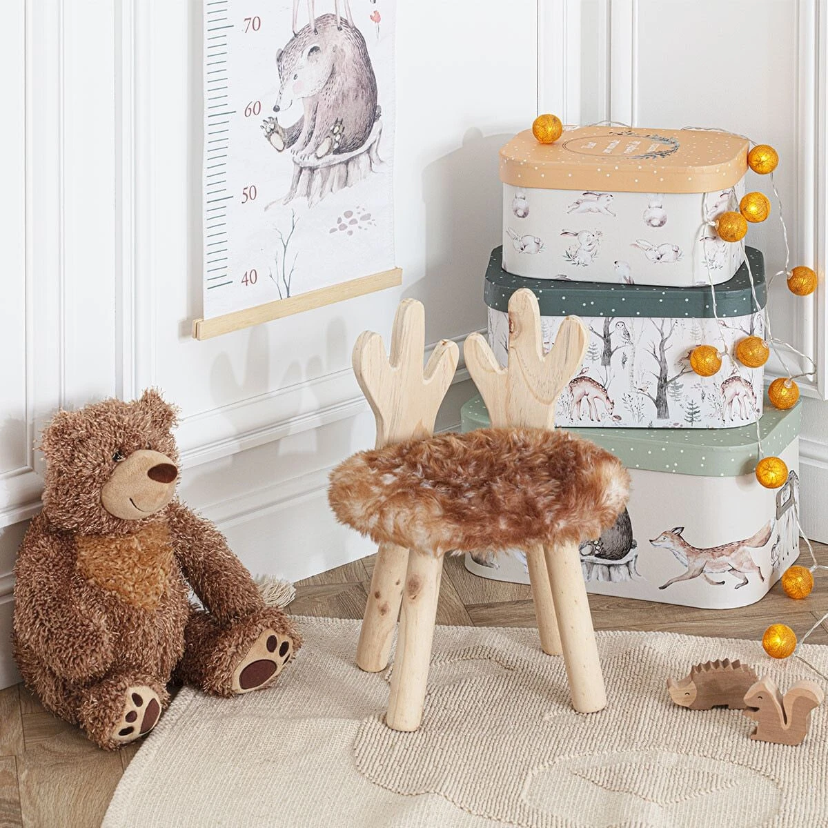 Matière : pieds en pin et assise en MDF (fibres de bois), polyester (effet fausse fourrure) et mousse polyurethane.