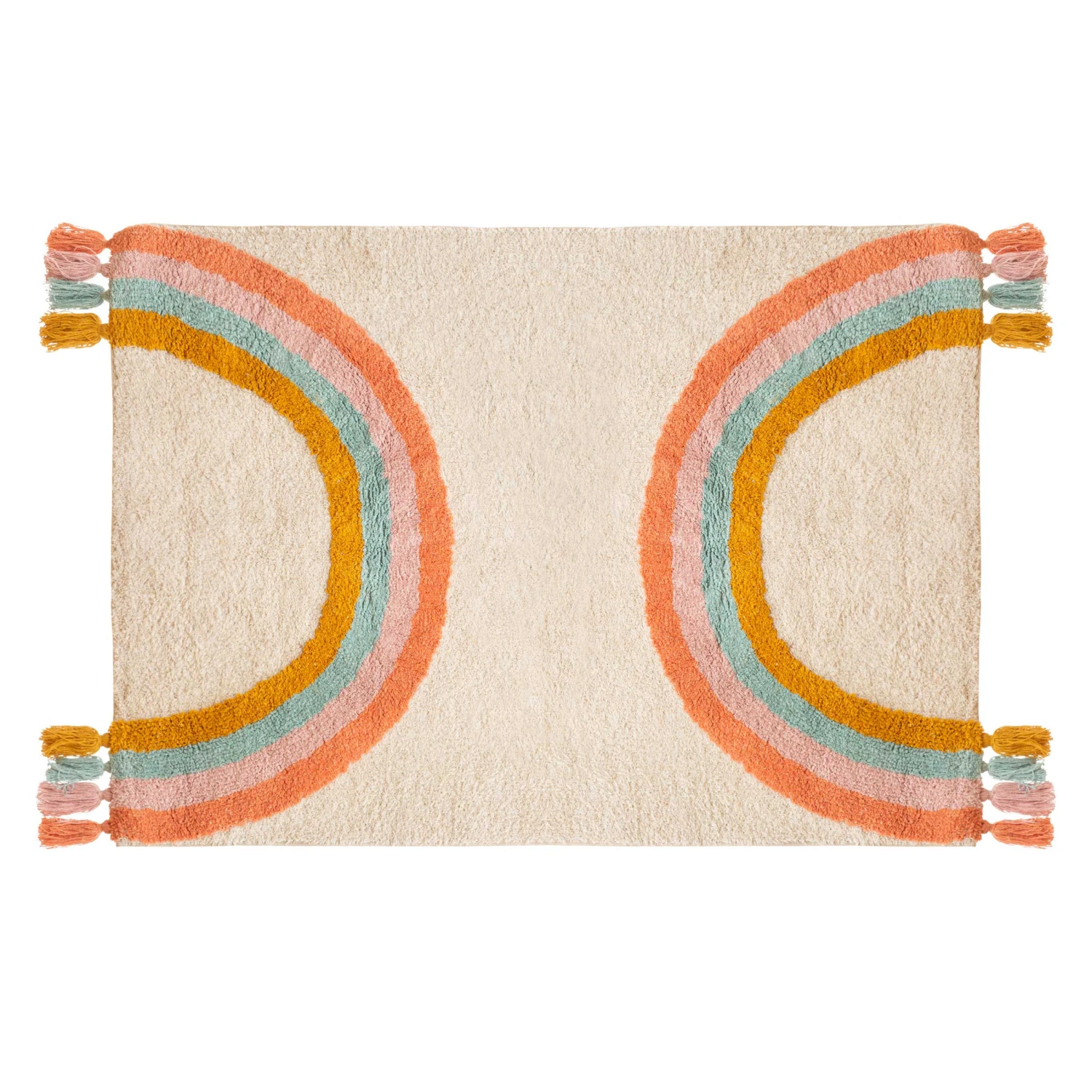 Imprimé : tapis à motifs arc en ciel et à pompons.