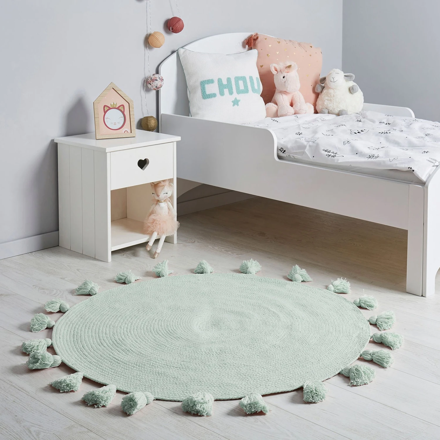 Un tapis douillet et confortable à pompons, qui ravit les enfants et apporte du confort dans leur chambre.