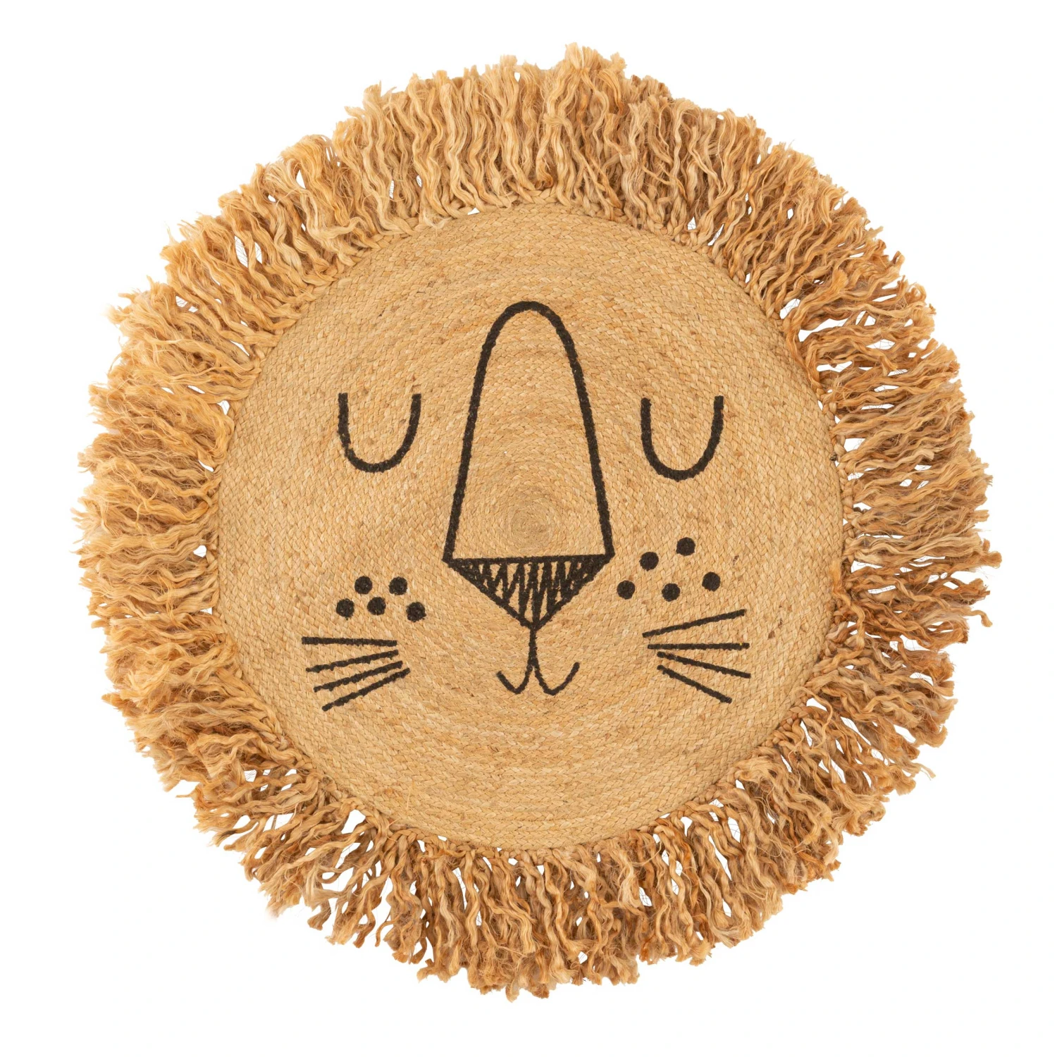 Pour une déco naturelle et fun dans la chambre de votre enfant, adoptez le tapis rond en jute Lion.