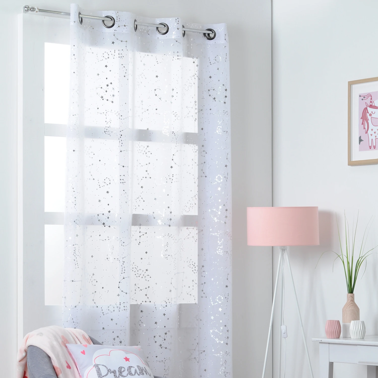 Mettez en valeur la fenêtre de votre fille avec ce voilage aux motifs argentés.