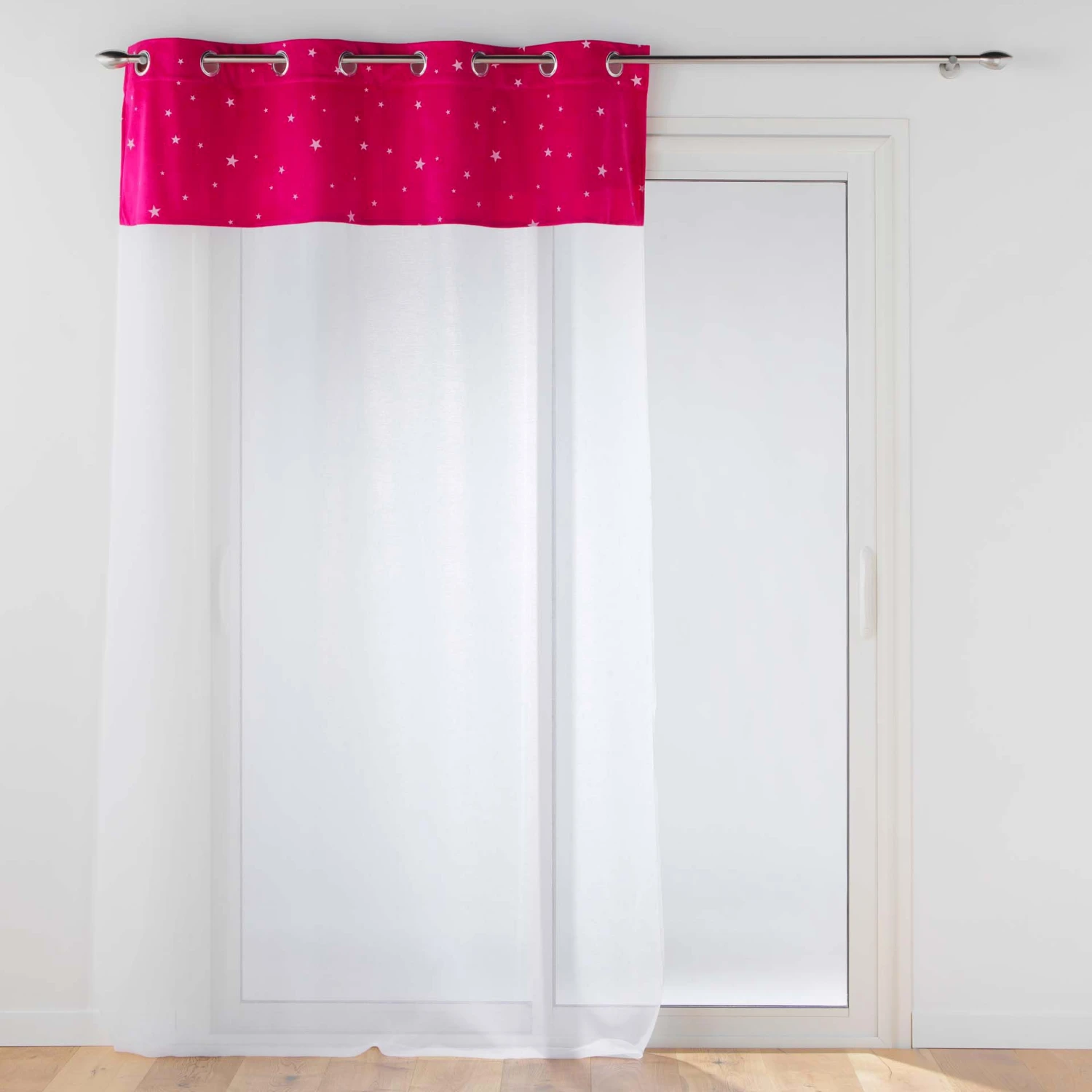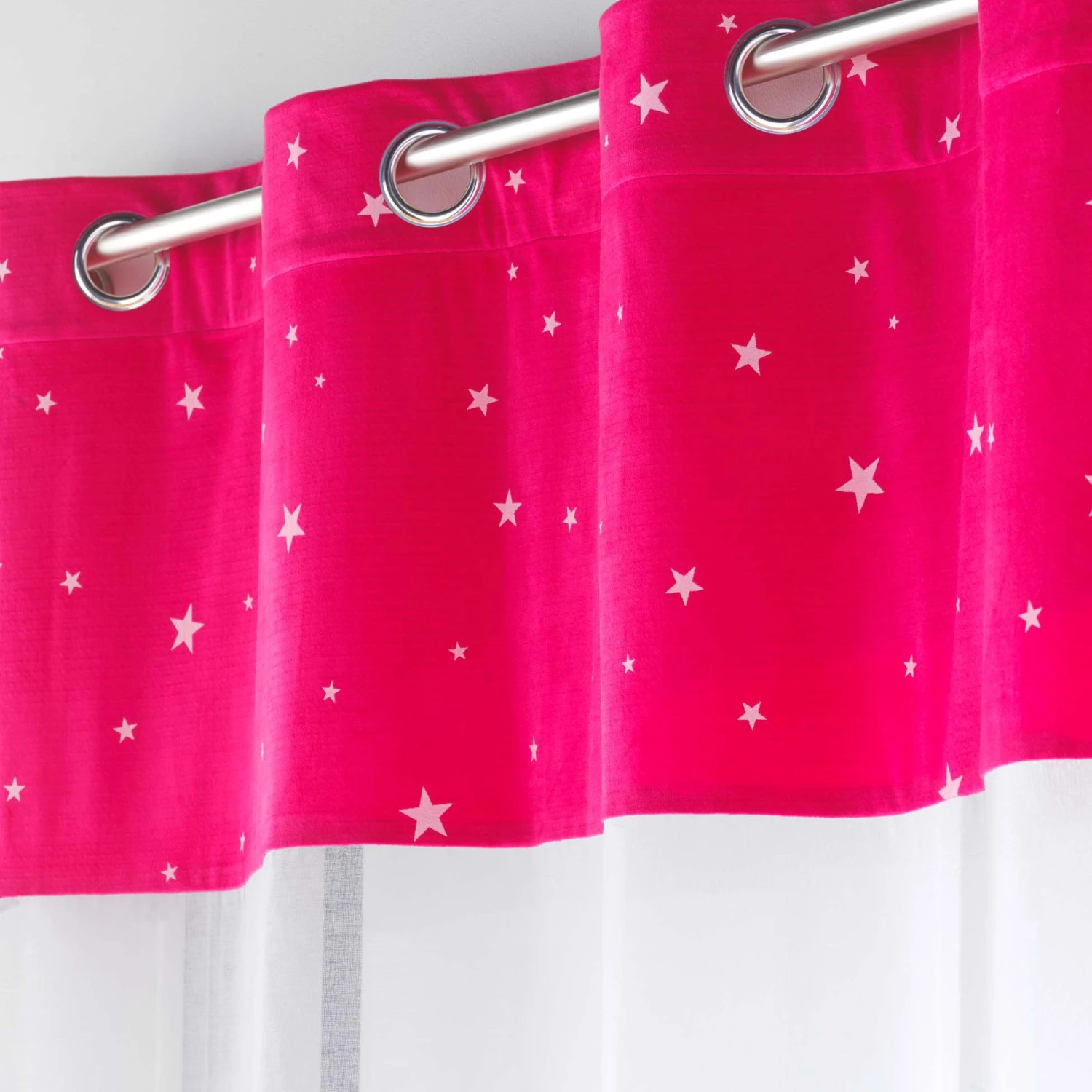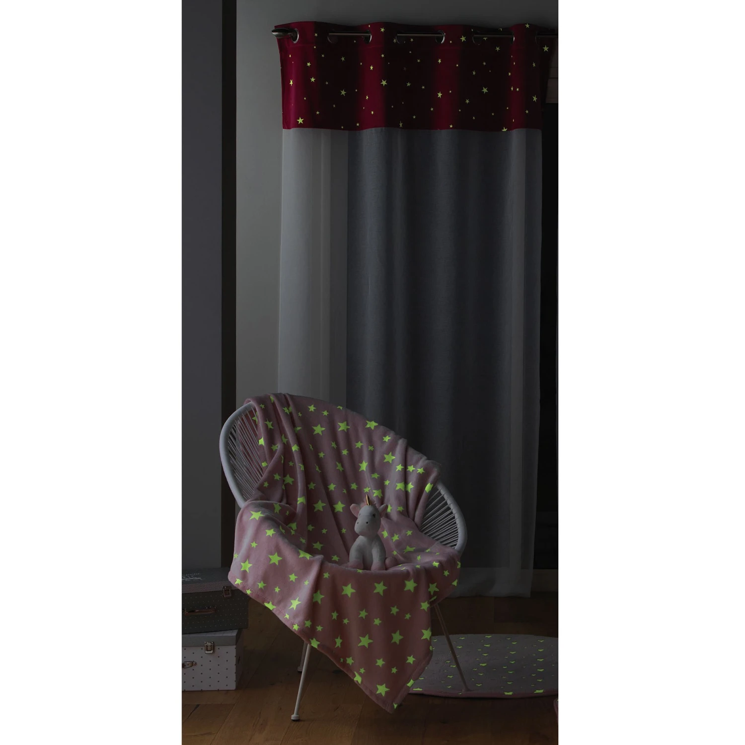 ImprimĂ© : voilage Ă motifs Ă©toiles. Certains motifs sont phosphorescents, ils brilleront dans l’obscuritĂ© une fois rechargĂ©s Ă la lumière du jour.